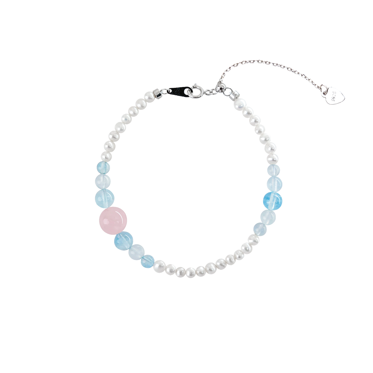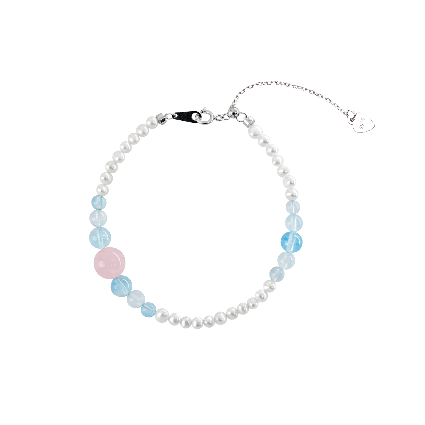 A gentle blend of blush-pink rose quartz, cool aquamarine beads, and luminous freshwater pearls creates a harmonious bracelet that radiates tenderness and calm — an elegant accent for any occasion.