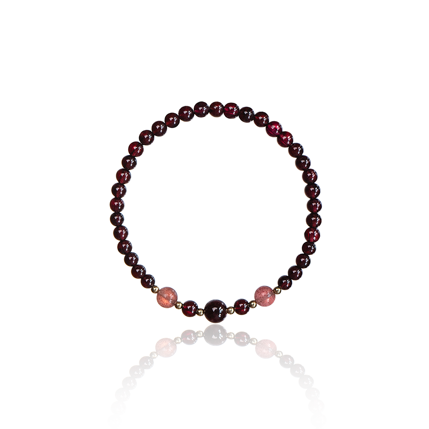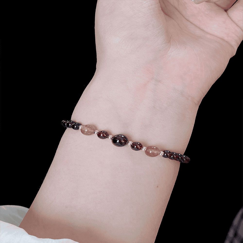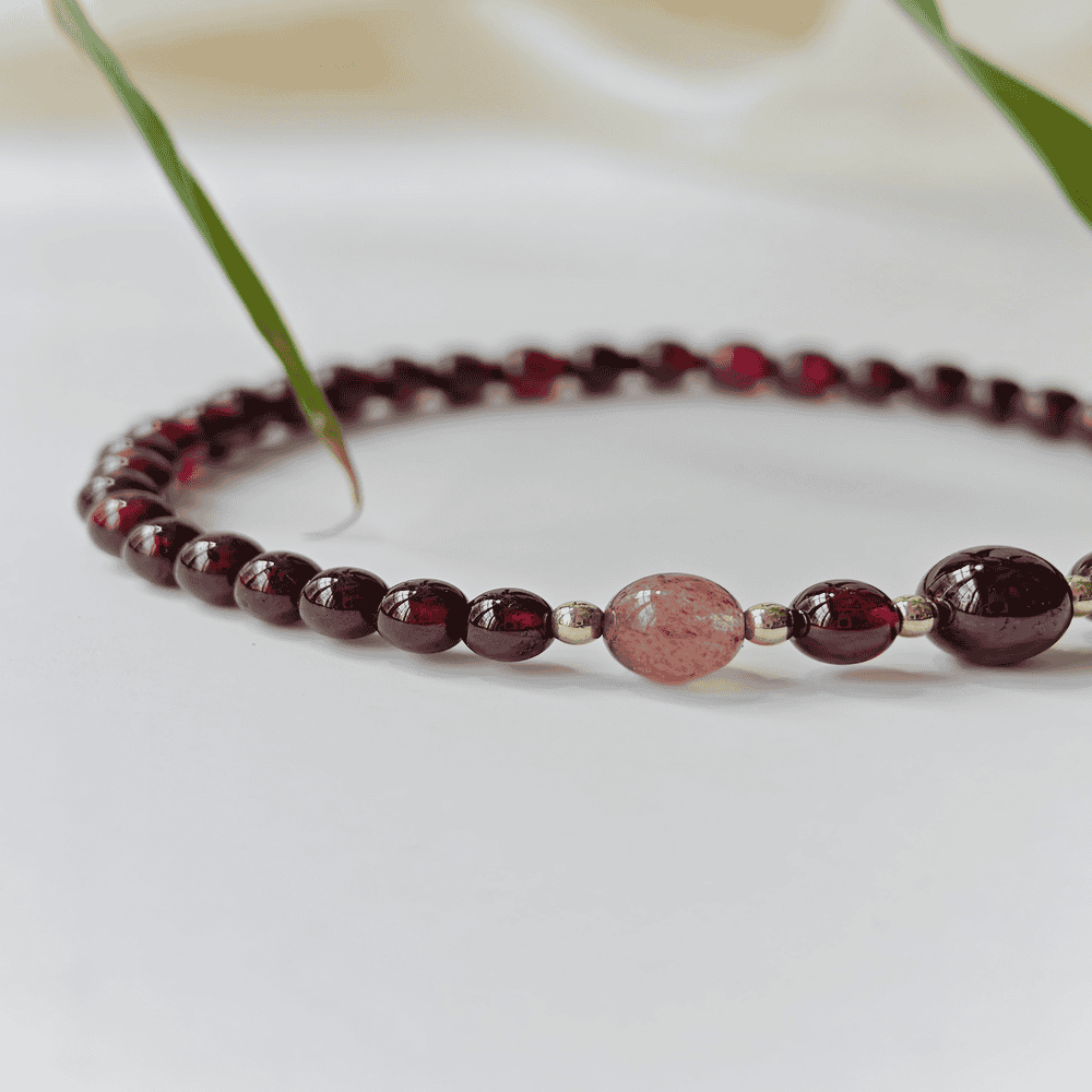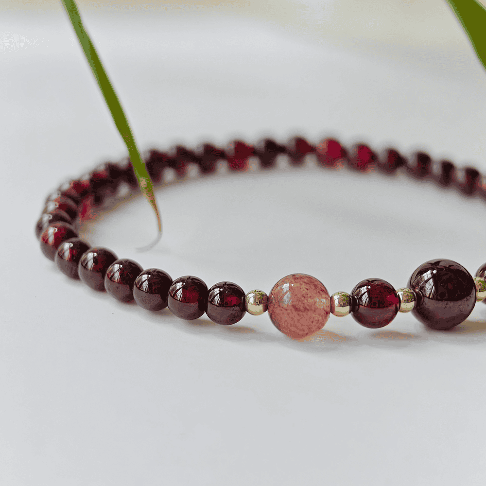 Deep Red Garnet Bracelet – Accented with Subtle Pink Beads and Gold Details, Offering a Timeless and Sophisticated Look for Any Occasion.