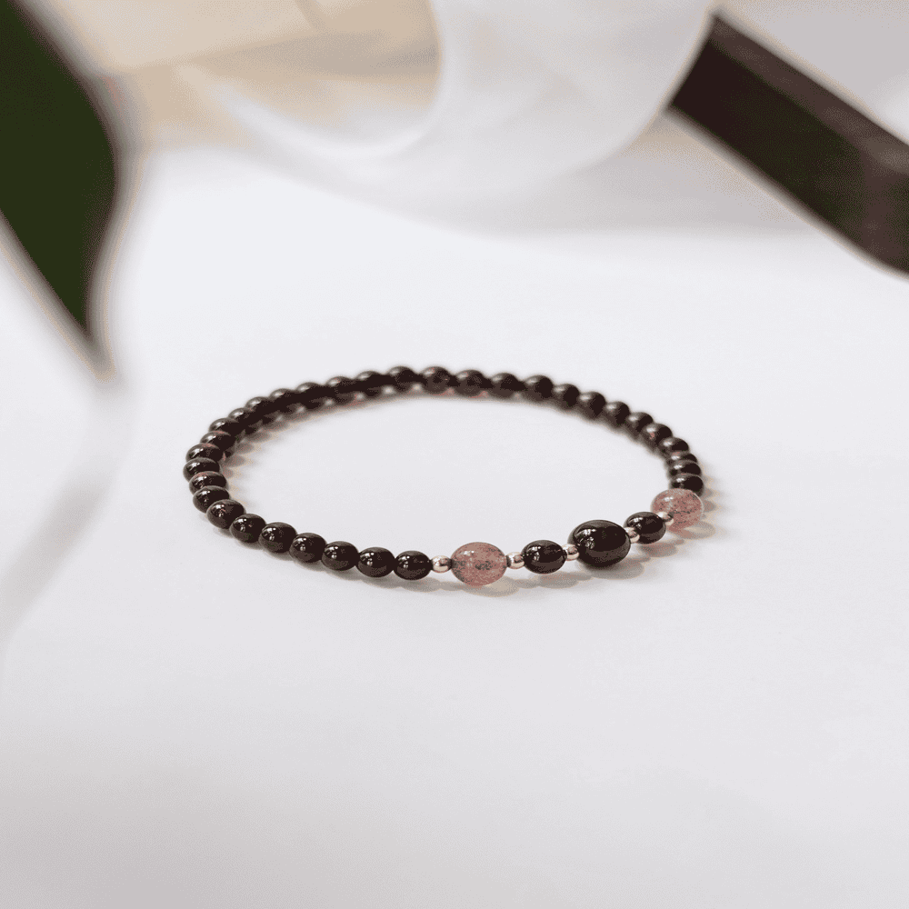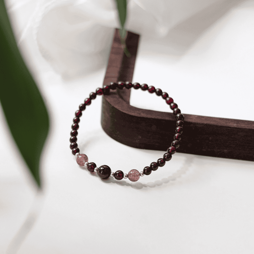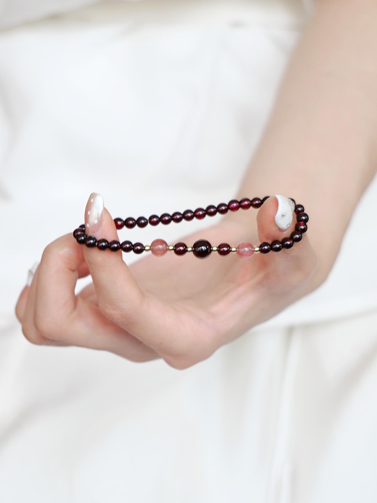 Deep Red Garnet Bracelet – Accented with Subtle Pink Beads and Gold Details, Offering a Timeless and Sophisticated Look for Any Occasion.