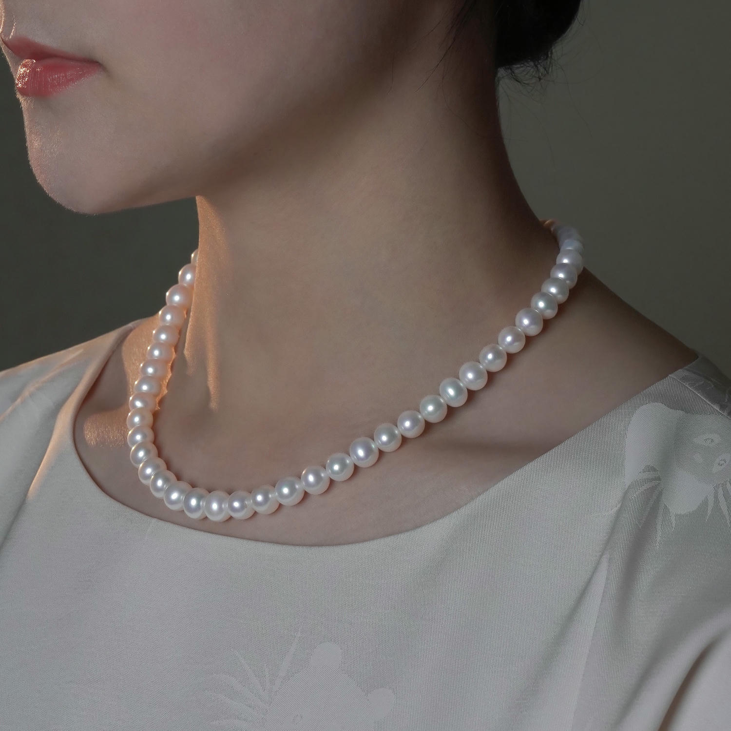 + Free ShippingCrafted with high-quality Akoya-style saltwater pearls, each bead is round, luminous and softly blushed with a mirror-like shine. Hand-knotted for durability and finished with a polished bean clasp, this elegant pearl necklace elevates workdays, dates, weddings and evenings with timeless designer quality.