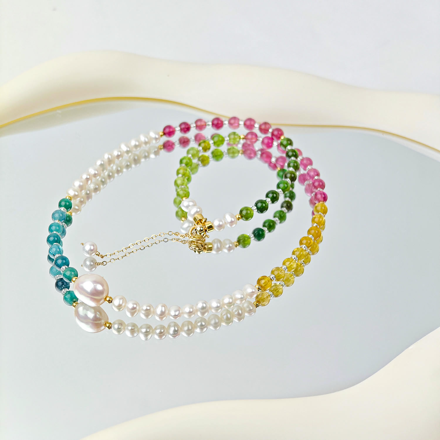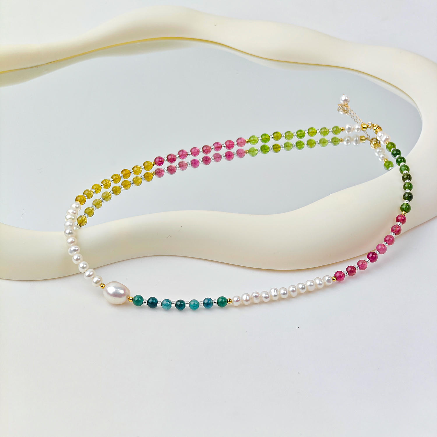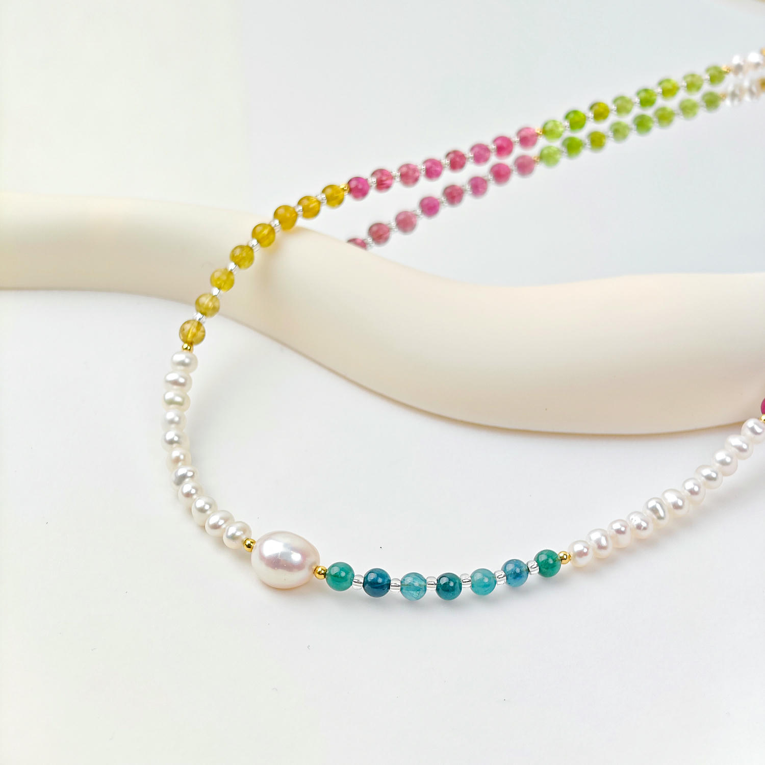 + Free ShippingCrafted with natural freshwater pearls, colorful tourmaline and crystal beads, this designer necklace features a baroque pearl focal point and a graceful rainbow gradient. Elegant yet modern, it elevates daily wear, office looks, dates and gatherings. Handcrafted with refined materials and adjustable length, it reflects premium quality, originality and timeless French-inspired style.
