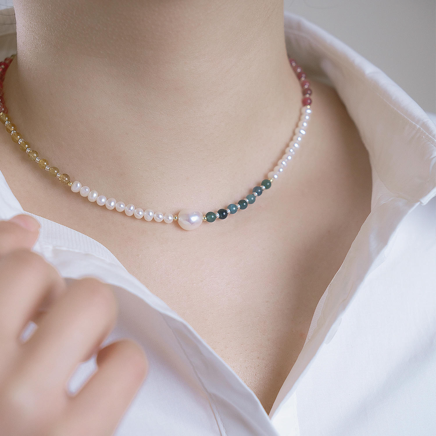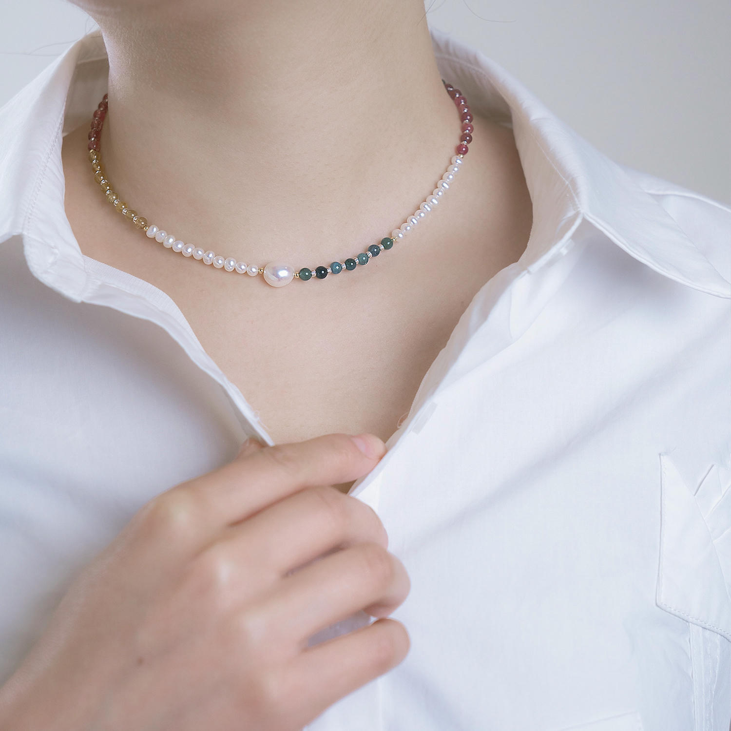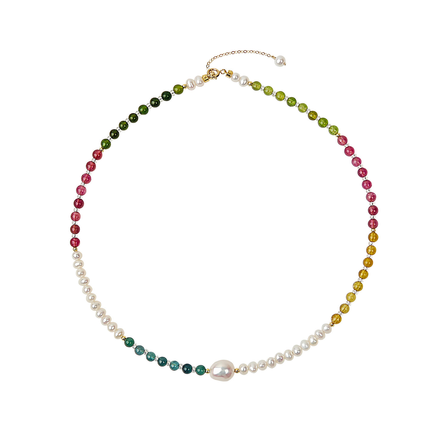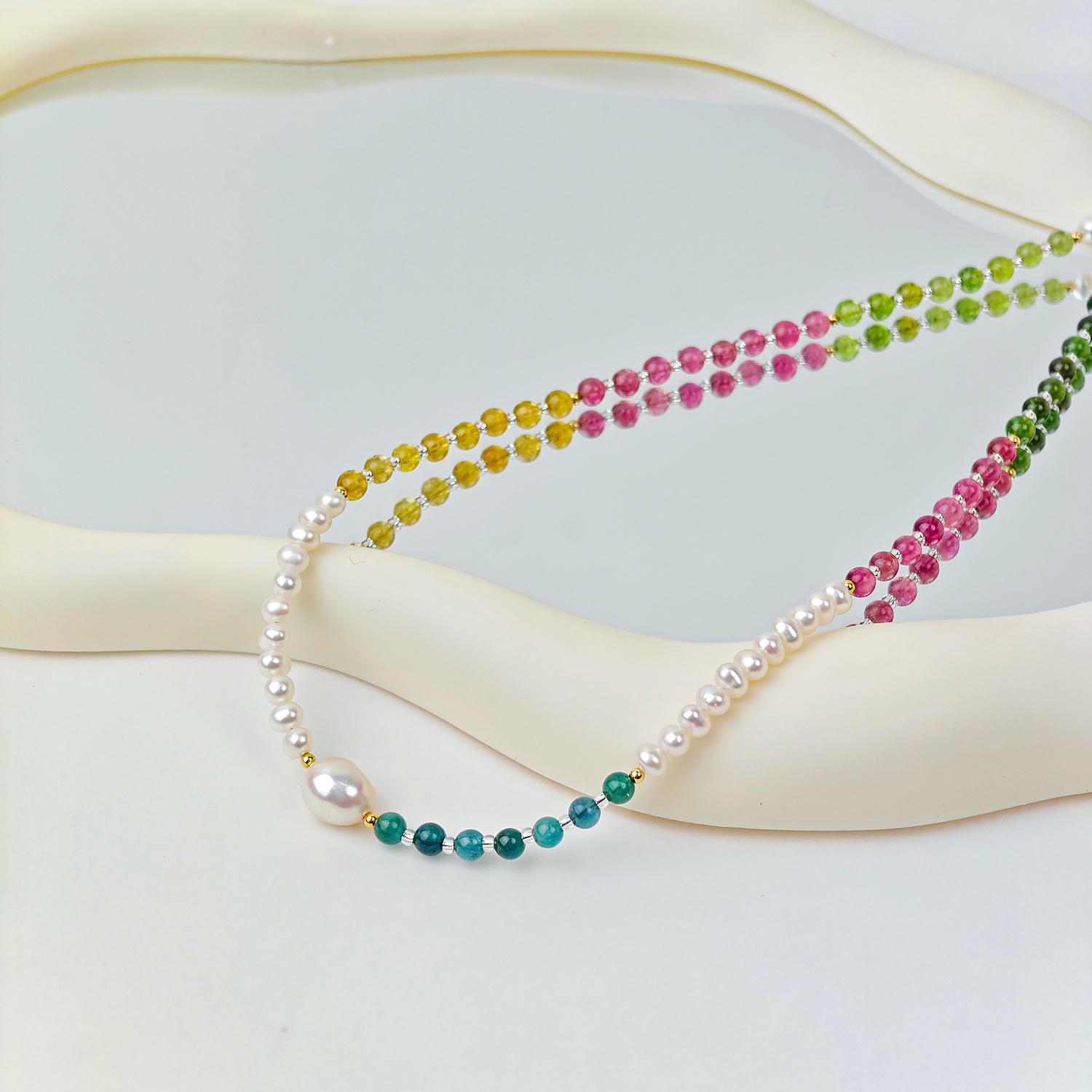 + Free ShippingCrafted with natural freshwater pearls, colorful tourmaline and crystal beads, this designer necklace features a baroque pearl focal point and a graceful rainbow gradient. Elegant yet modern, it elevates daily wear, office looks, dates and gatherings. Handcrafted with refined materials and adjustable length, it reflects premium quality, originality and timeless French-inspired style.