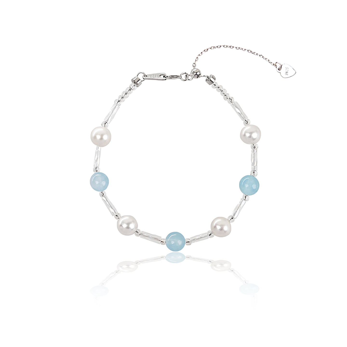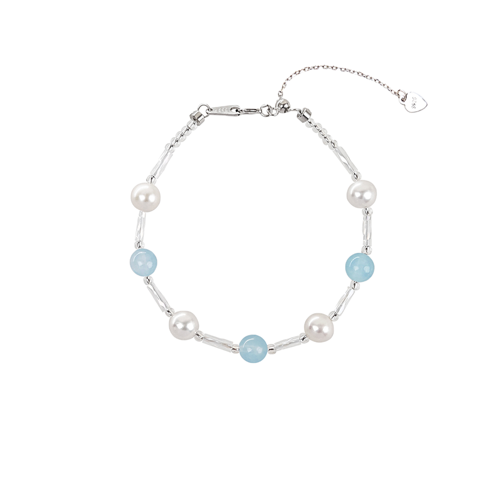 Combining the serene blue of aquamarine with the gentle luster of freshwater pearls, this bracelet radiates tranquility and sophistication — a versatile piece to complement any outfit.