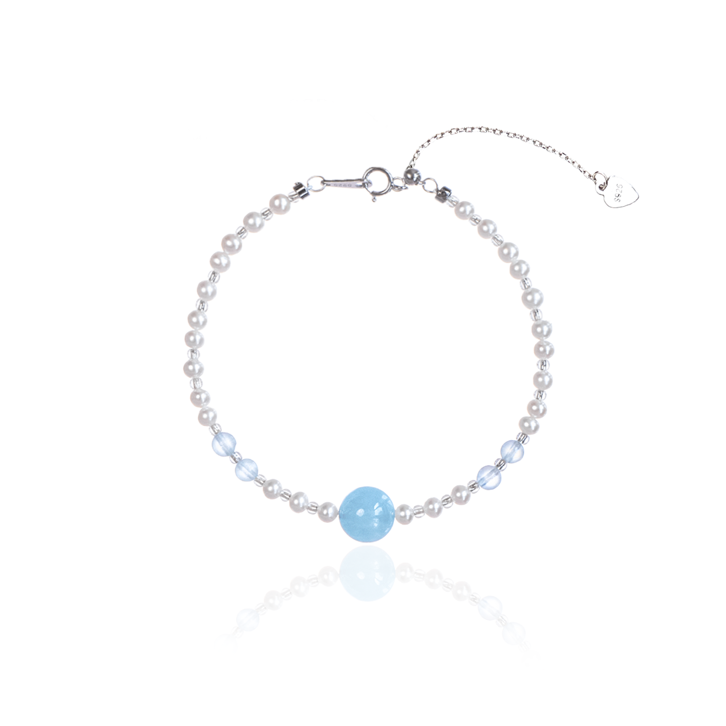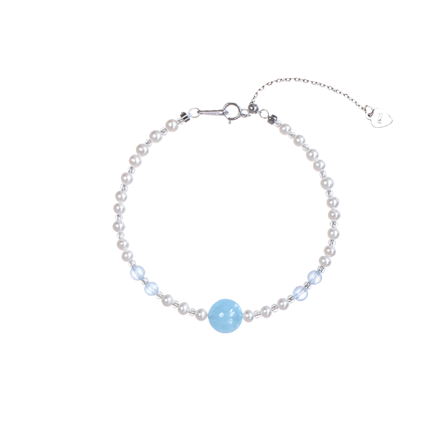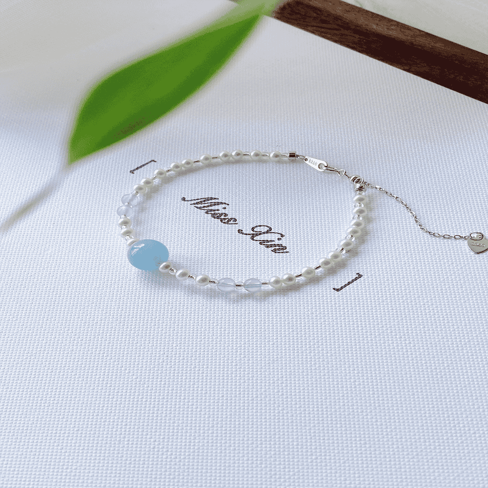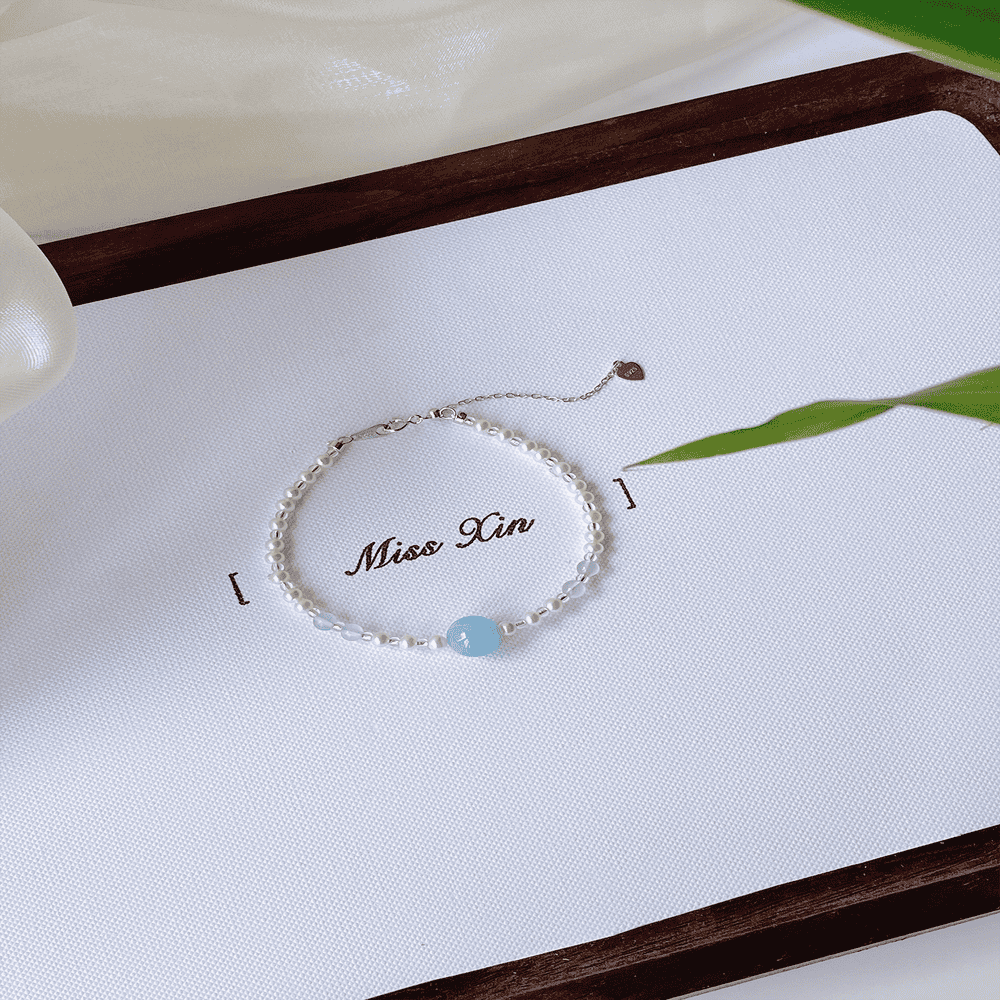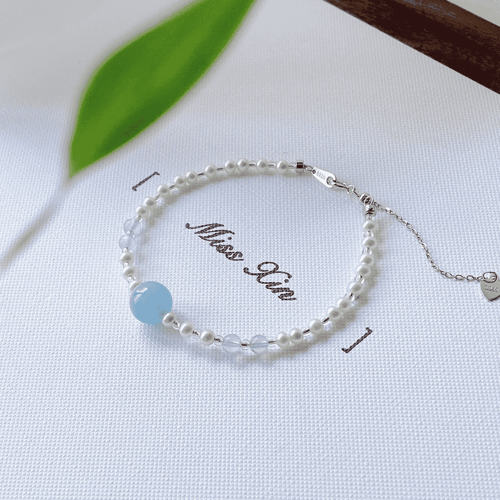 Featuring a central aquamarine bead flanked by lustrous freshwater pearls and translucent blue accents, this bracelet captures a fresh and airy elegance — perfect for adding a soft touch to any look.