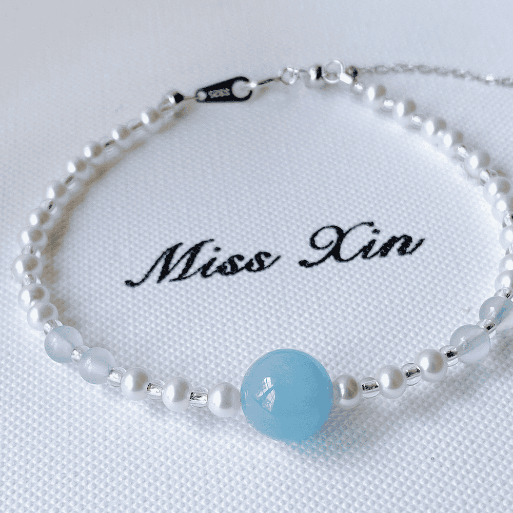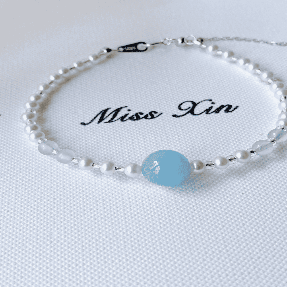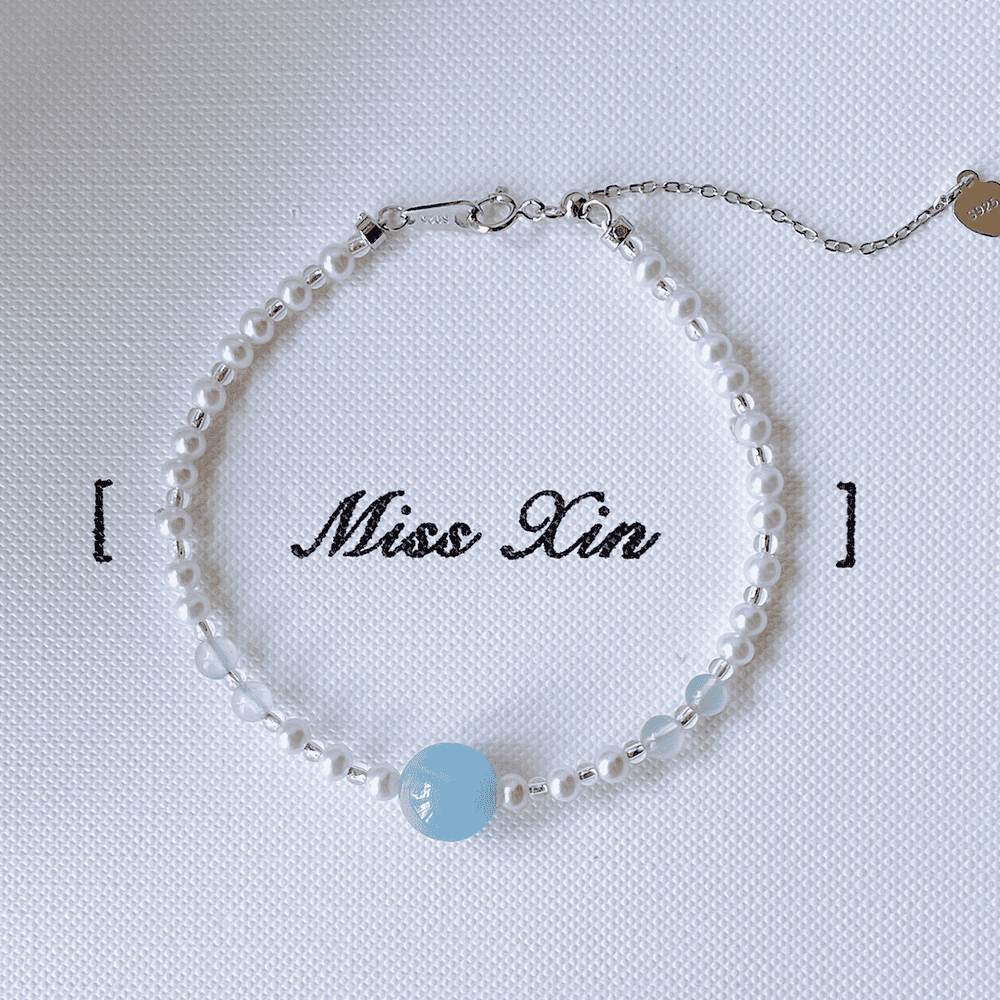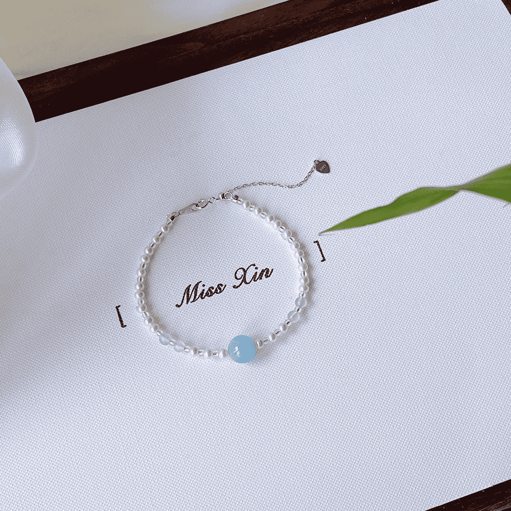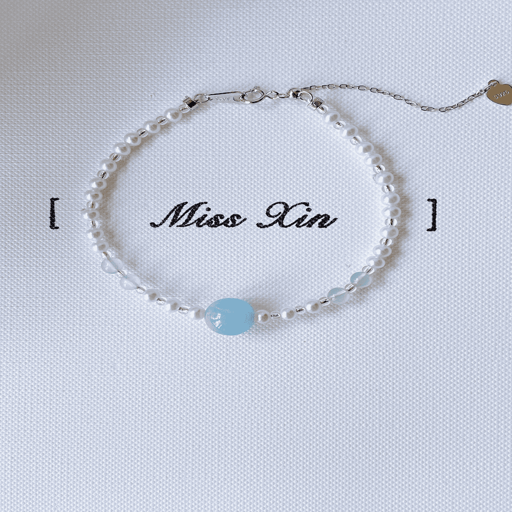 Featuring a central aquamarine bead flanked by lustrous freshwater pearls and translucent blue accents, this bracelet captures a fresh and airy elegance — perfect for adding a soft touch to any look.