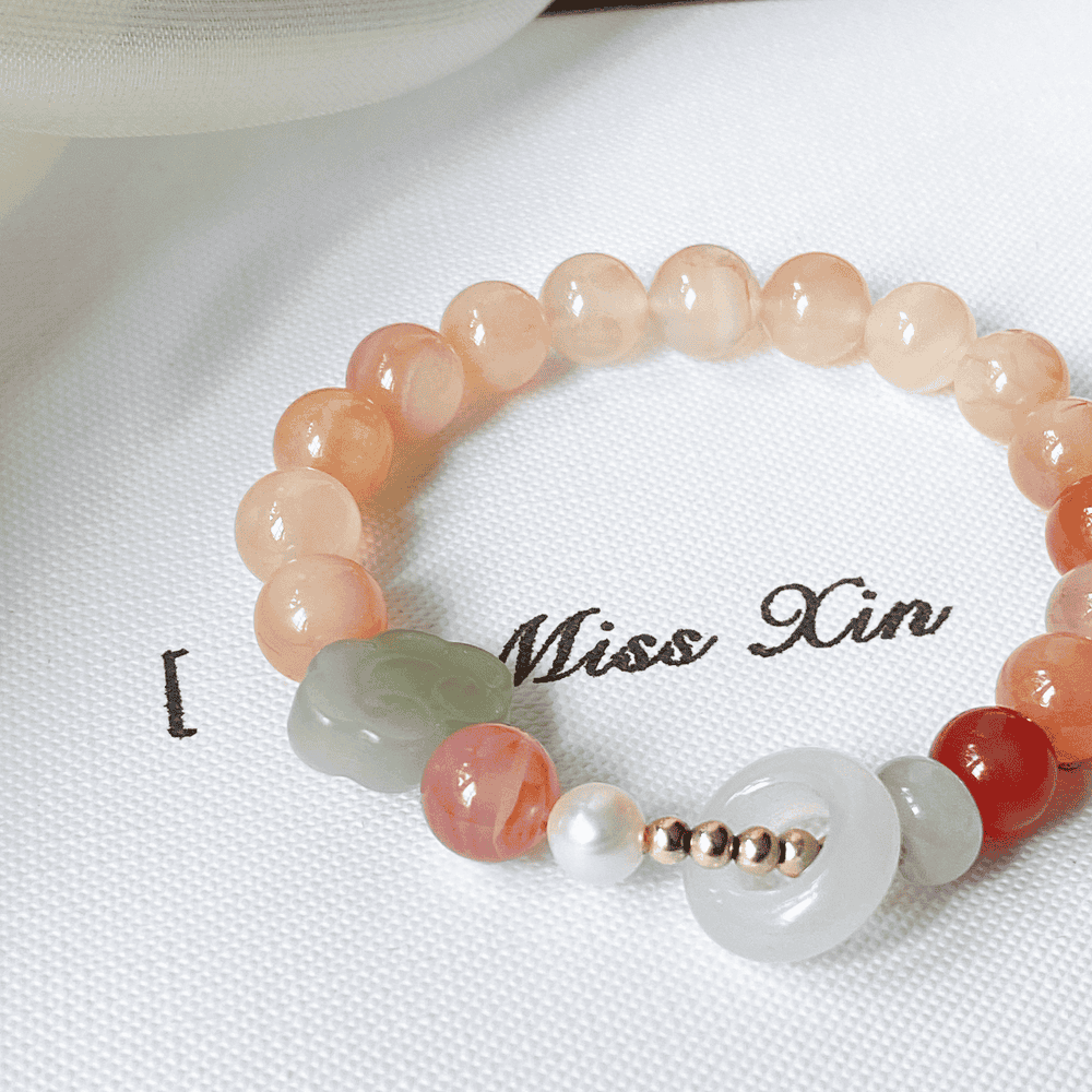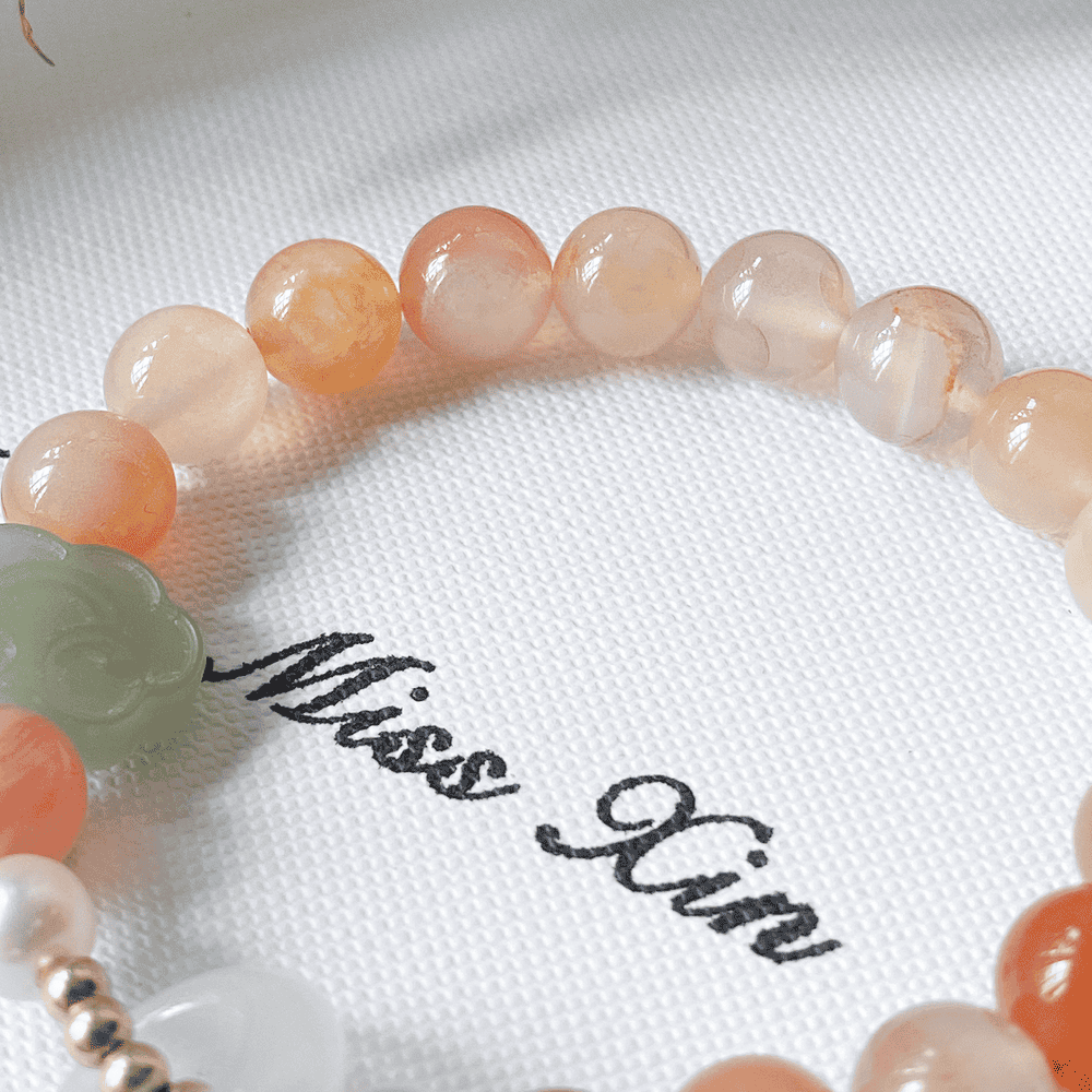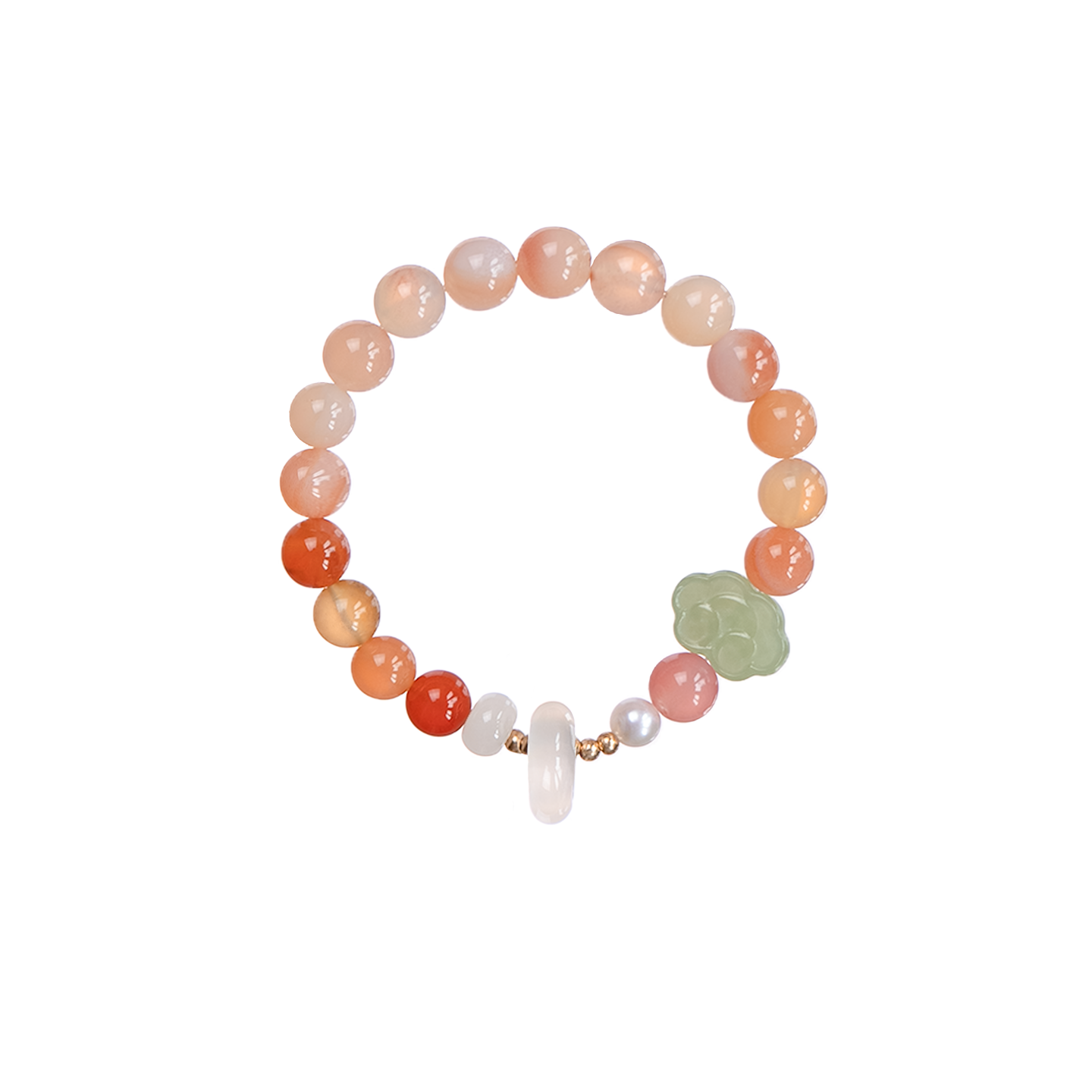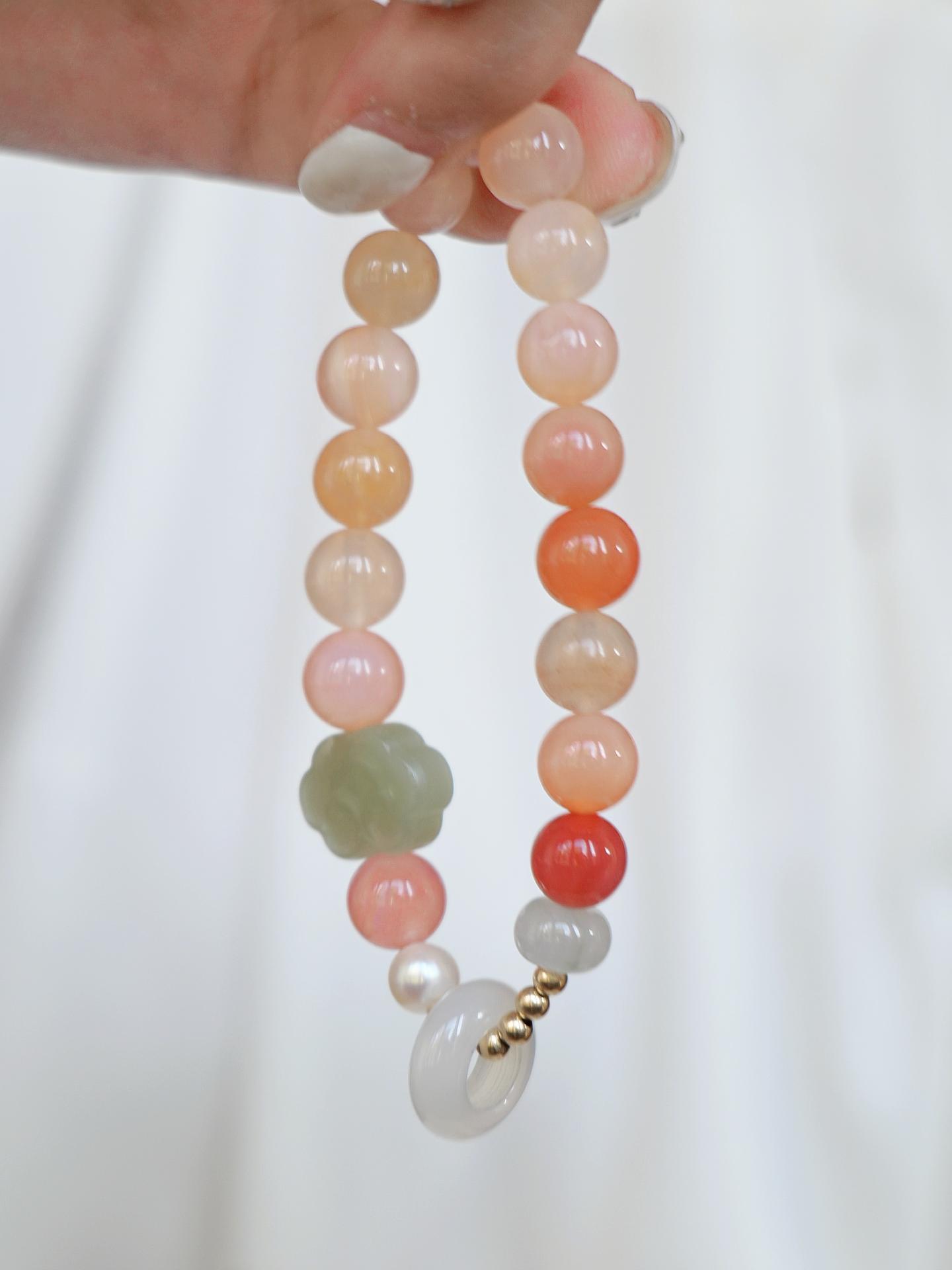 Gradient orange agate beads accented with a carved green jade charm and central white jade ring, blending elegance with a touch of luck.
