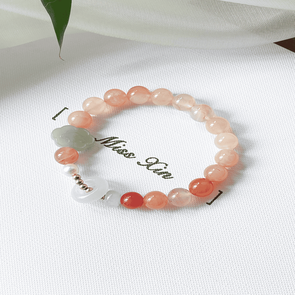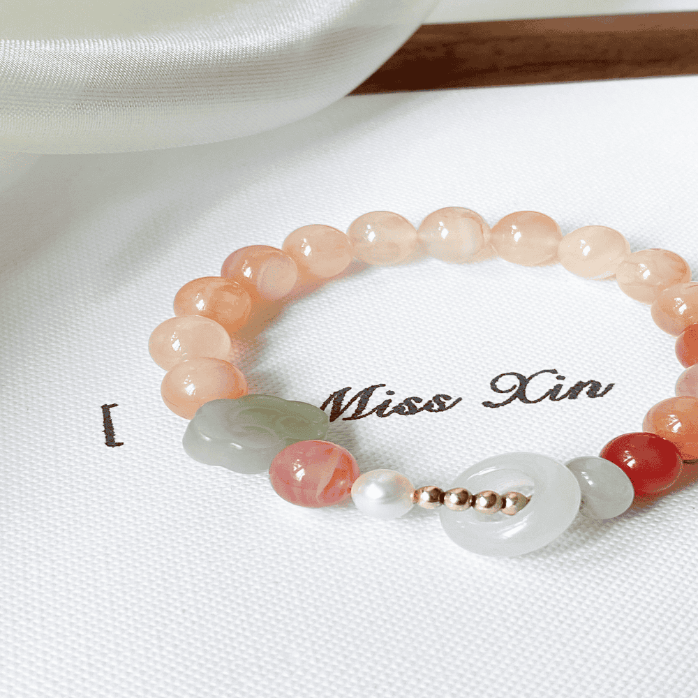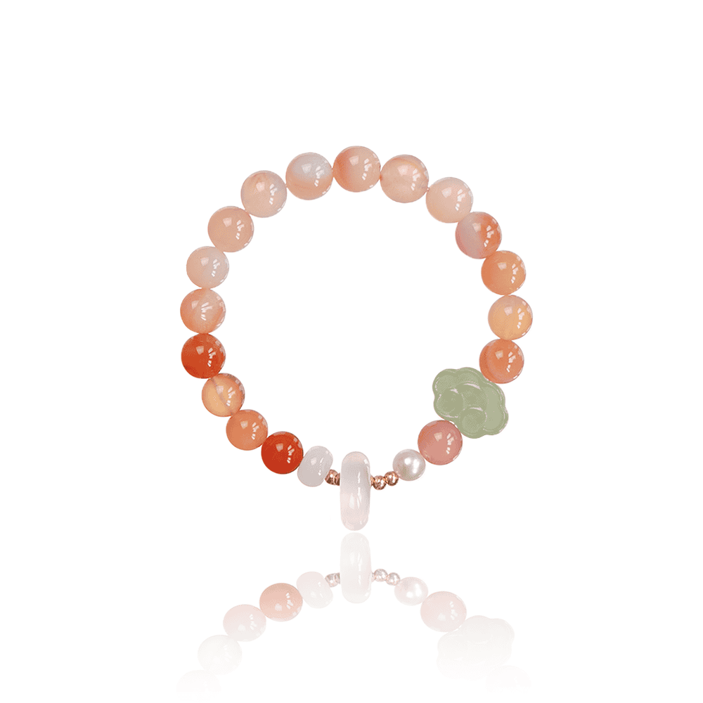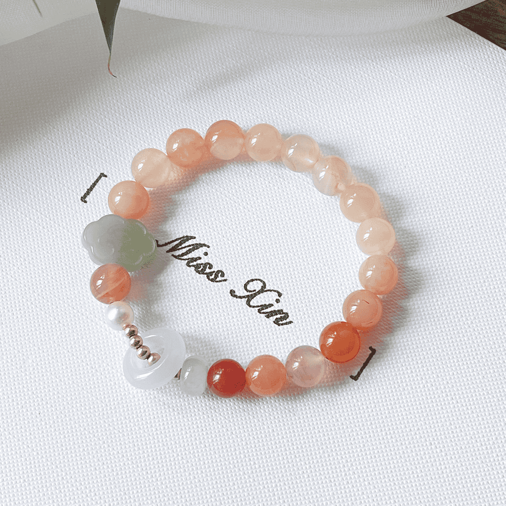 Gradient orange agate beads accented with a carved green jade charm and central white jade ring, blending elegance with a touch of luck.